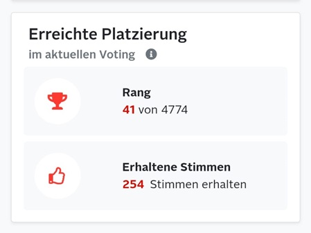 Dank Eurer Unterstützung haben wir es unter die Top 50 geschafft! 🥳